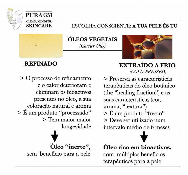 - Processo de extração: Opta por óleos não refinados e extraídos a frio (cold-pressed) para garantir a pureza e eficácia. Se esta identificação não estiver expressa é porque provavelmente estás perante um óleo que foi sujeito a processos de refinamento, que foi lesado na sua composição original (Hashempour-Baltork et al., 2022) e que perdeu as propriedades que beneficiariam a pele.